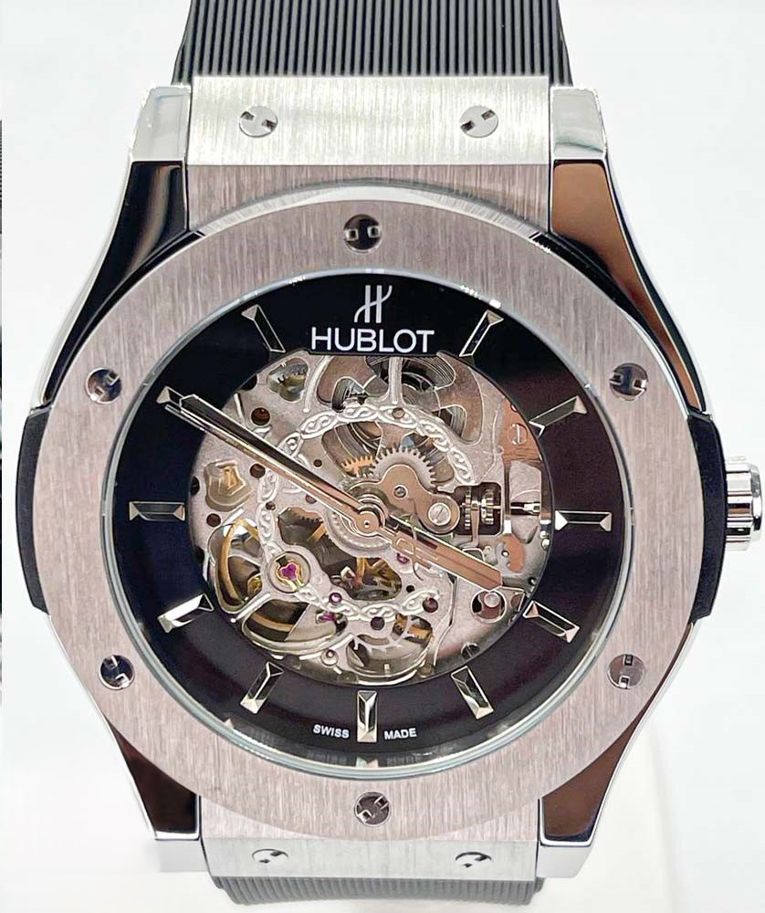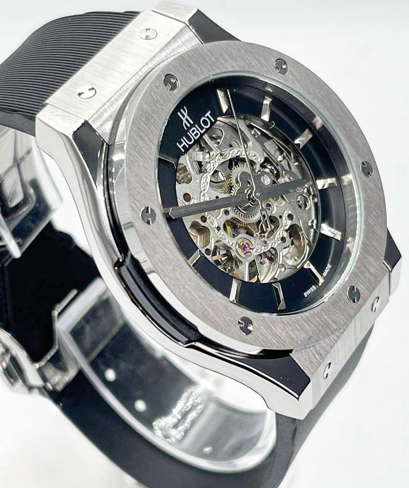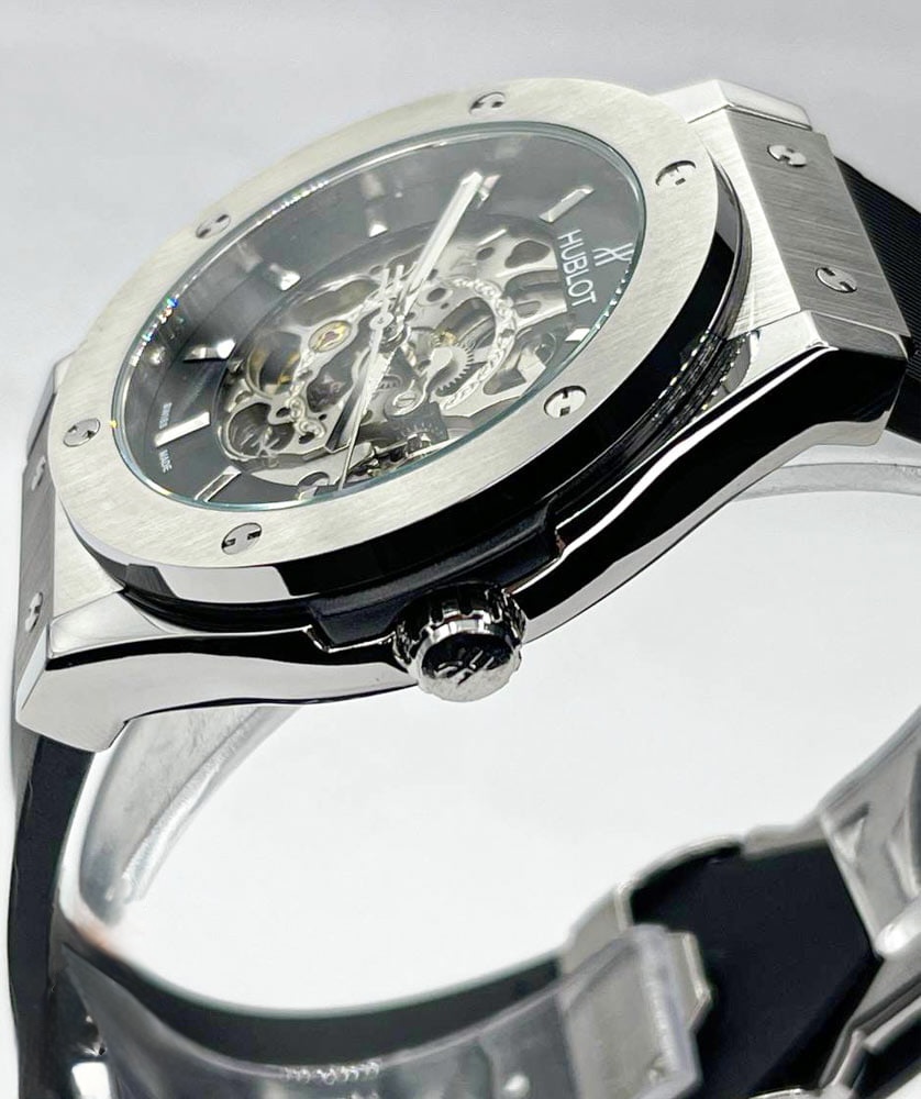 Kuti prej çeliku inox me një rrip gome të zi me një majë lëkure të zezë (aligator) (të qepur). Kornizë e fiksuar prej çeliku inox. Numërator i zi (qendër skeleti) me akrepa të shndritshëm me nuancë argjendi dhe shënjues të orës indeks. Shënjues minutash rreth buzës së jashtme. Lloji i numeratorit: Analog. Akrepa dhe shënjues ndriçues. Shfaqje e datës midis pozicioneve të orës 4 dhe 5. Kronograf – tre nën-numra që shfaqin: 60 sekonda, 30 minuta dhe 12 orë. Mekanizëm automatik Hublot, që përmban 27 gurë të çmuar, i përbërë nga 252 pjesë, që rrahin me 28800 vph, dhe ka një rezervë energjie prej afërsisht 42 orësh. Kristal safiri rezistent ndaj gërvishtjeve. Kurorë tërheqëse/shtypëse. Pjesa e pasme e kutisë skelet. Formë e rrumbullakët e kutisë. Madhësia e kutisë: 40 mm. Trashësia e kutisë: 15 mm. Gjerësia e rripit: 23 mm. Gjatësia e rripit: 8.5 inç. Kapëse e palosur me një buton lëshues. Rezistent ndaj ujit.
