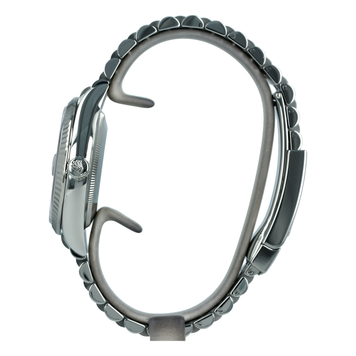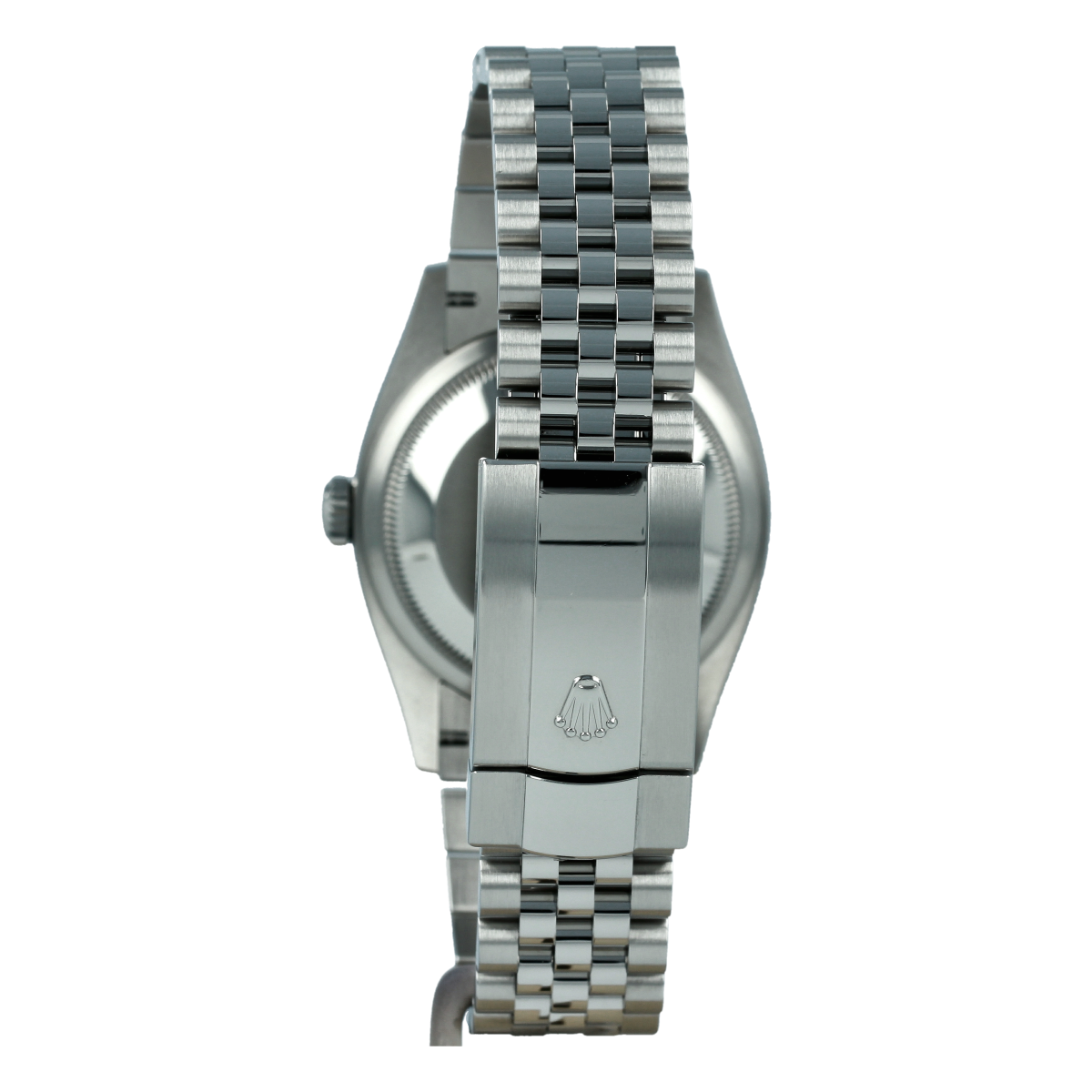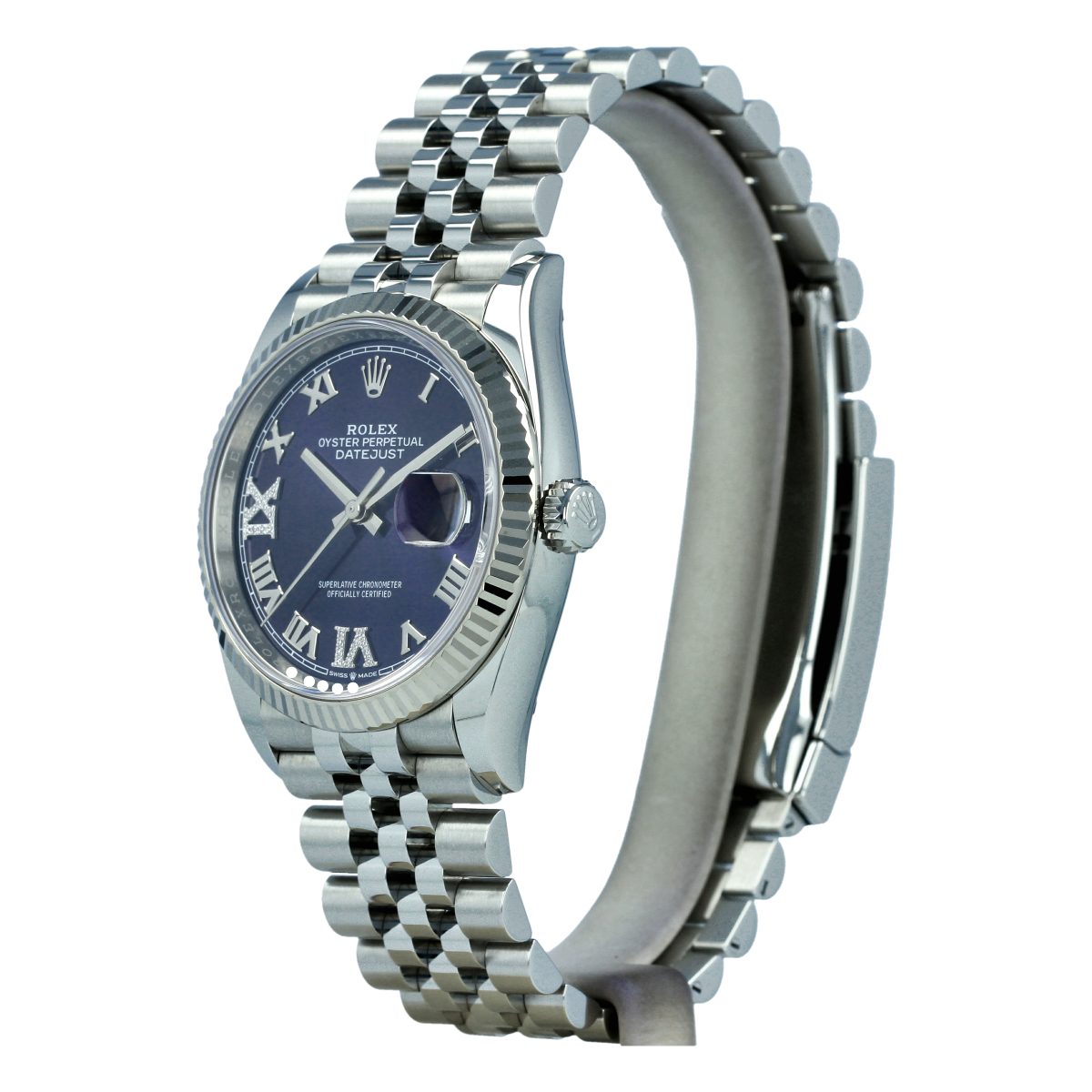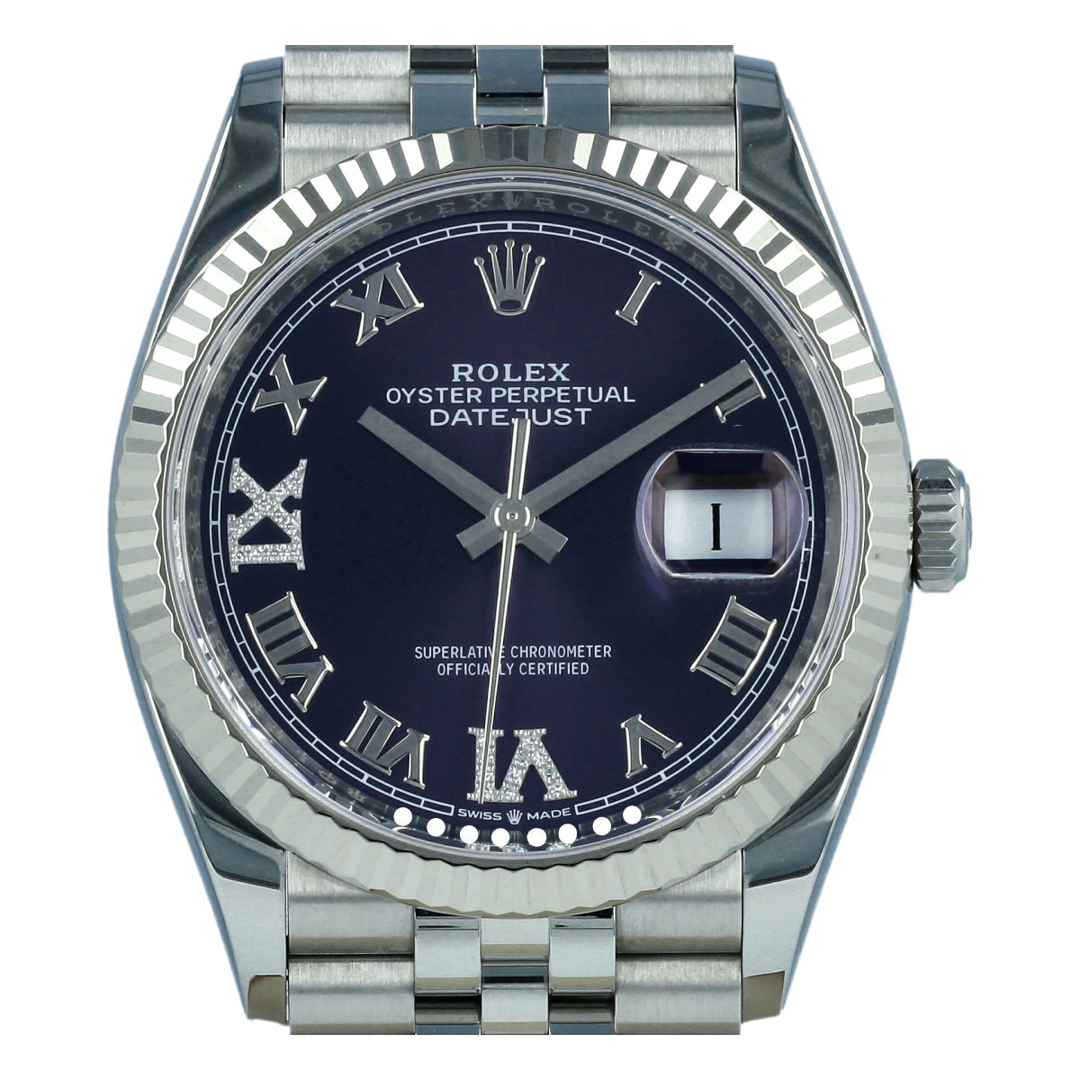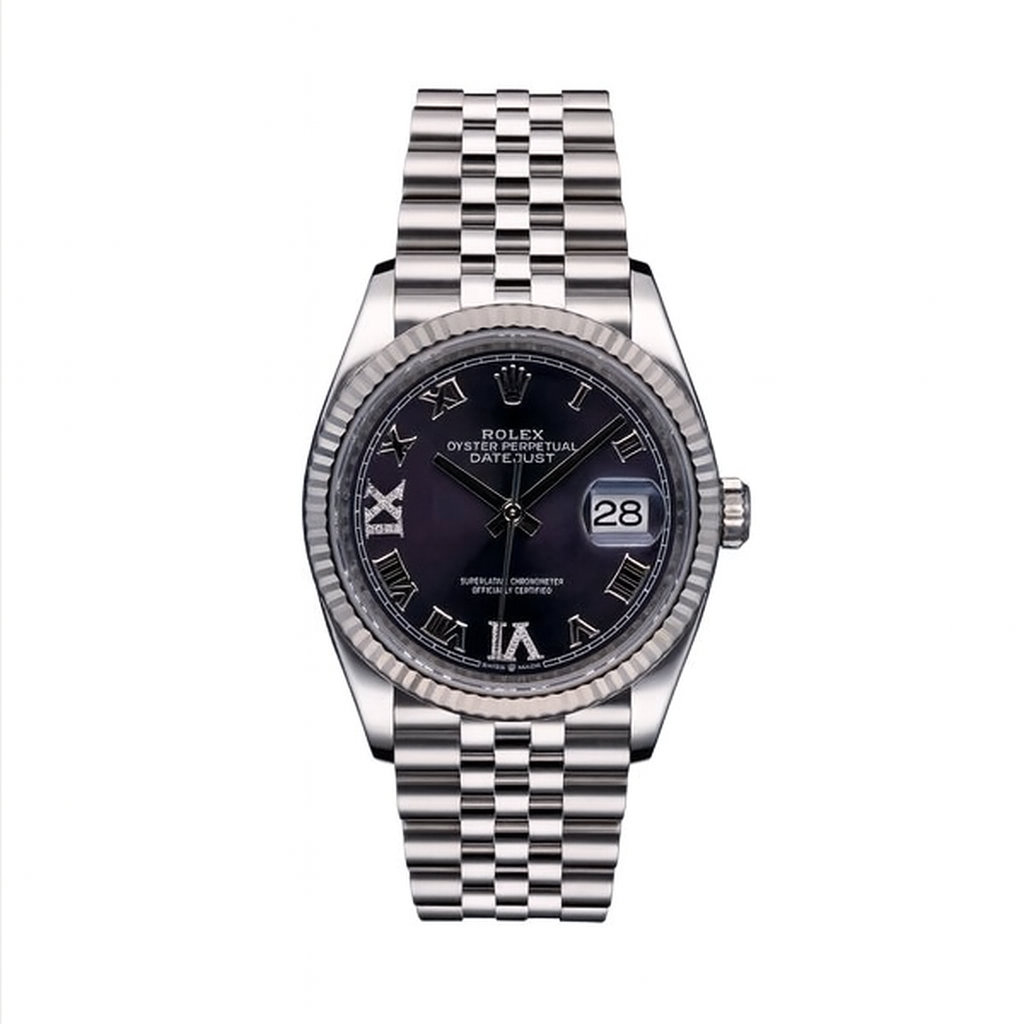 Rolex Datejust, me një kuti 36 mm prej çeliku Oyster, kornizë të bardhë të valëzuar, ekran patëllxhan me numra romakë dhe VI dhe IX të mëdhenj në ngjyrë ari të bardhë të vendosur me , tregues date në orën 3. Kristal safir. Mekanizëm automatik kalibri 3235. Byzylyk Jubilee Oystersteel me kapëse Oyster të palosshme me sistem zgjatimi Easylink comfort. I plotë me kuti.