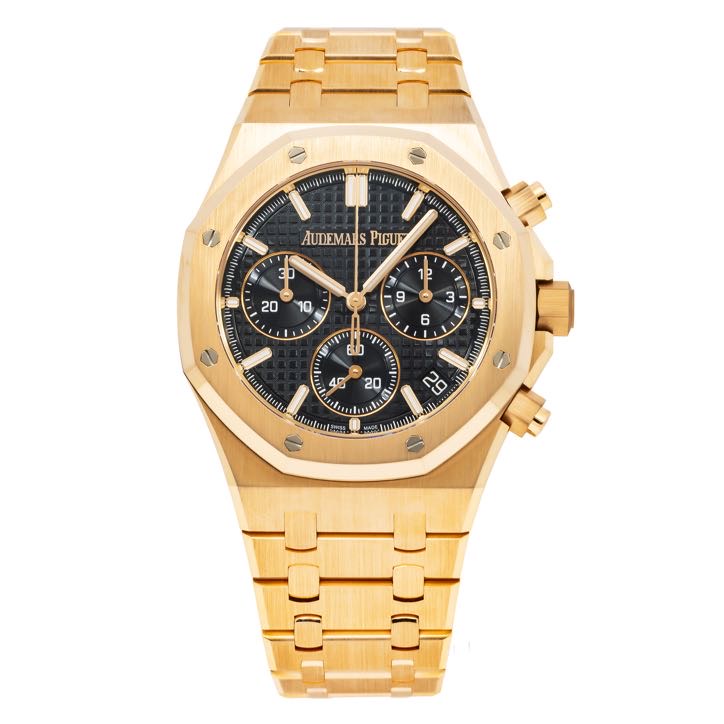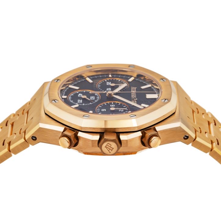 Orë dore për meshkuj Audemars Piguet Royal Oak Rose Gold Black Dial. Mekanizëm kronografik automatik me dredhje automatike. Kuti tetëkëndëshe, me diametër. 1 kurorë që vidhoset dhe dy shtytës. Pjesa e pasme e kutisë është e fortë. Kornizë e pikësuar me 8 vida karakteristike. Kristal safir rezistent ndaj gërvishtjeve. Numërator i zi me model vaflash Grande Tapisserie, shënues orësh dhe akrepa të ndriçuar me shkop. Akrep qendror i sekondave. Tre nën-numëratorë kronografi — që tregojnë sekonda të vogla, 30 minuta dhe 12 orë.